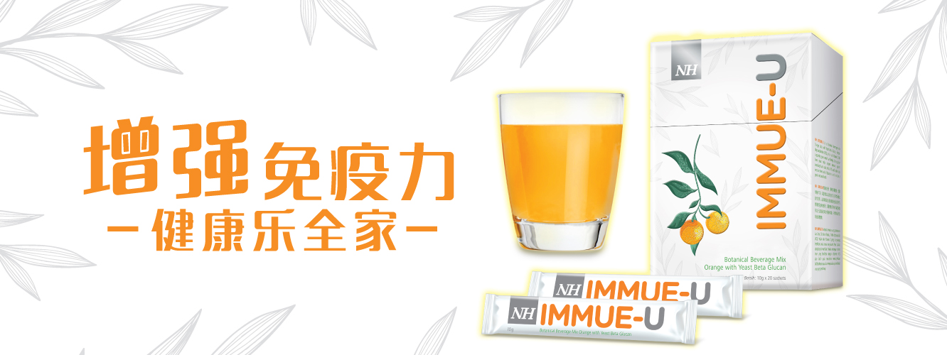 NH Immue-U 是一款融合酵母β 葡聚糖、低聚果糖、菊苣纤维、维生素C和天然橙汁粉的健康饮料。这些有益成分相互配合可有效的增强您的免疫系统。NH Immue-U 不含防腐剂、人造色素和味素。每天饮用有助强化免疫系统,让您保持最佳的健康状态。